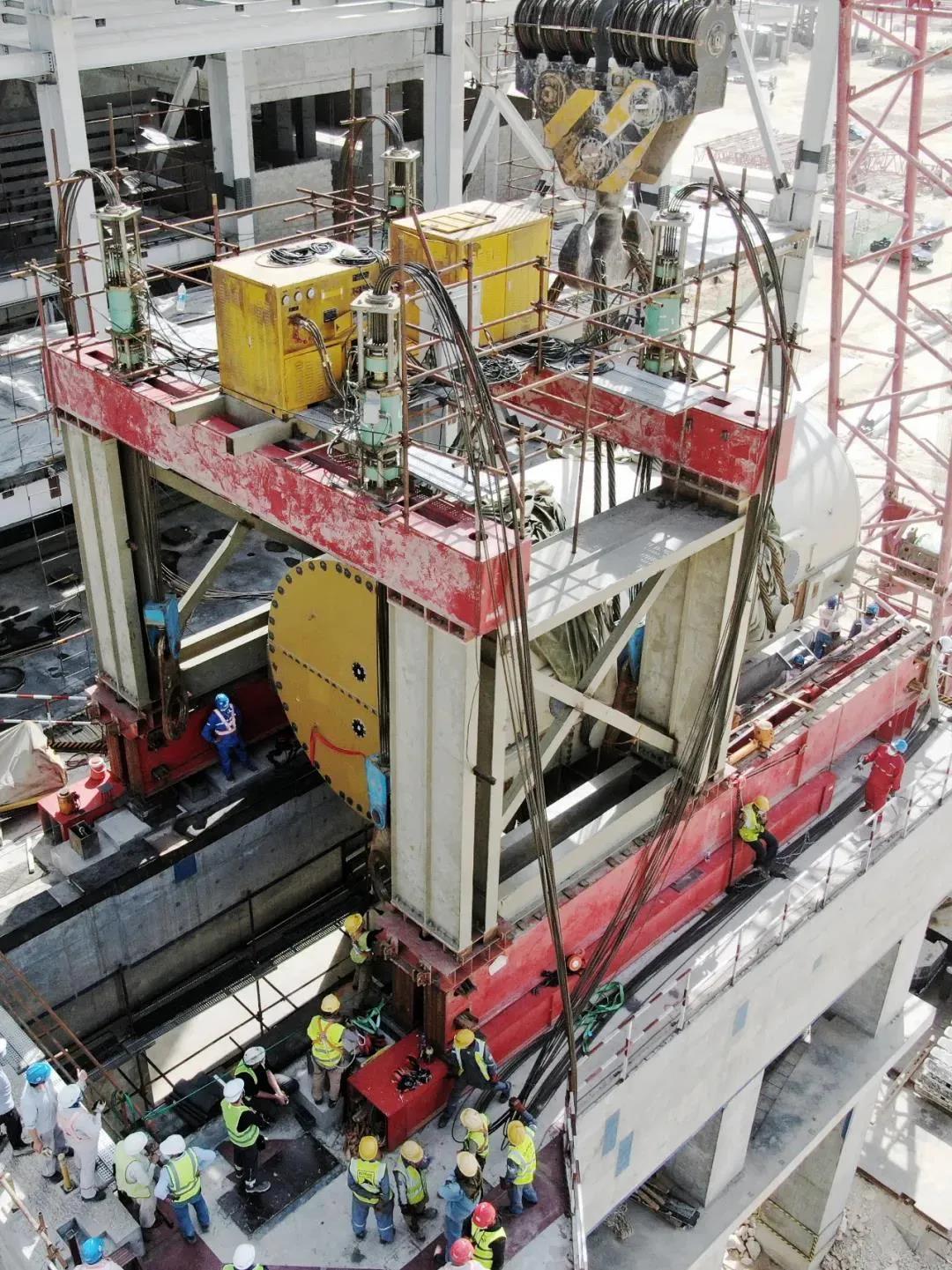据了解,巴基斯坦贾姆肖罗2×660MW超超临界燃煤电站项目发电机定子净重450吨,尺寸为:11635mm(长)×5096mm(宽)×4531mm(高),采用630T履带吊和劳辛格液压提升装置配合的整体吊装方案。