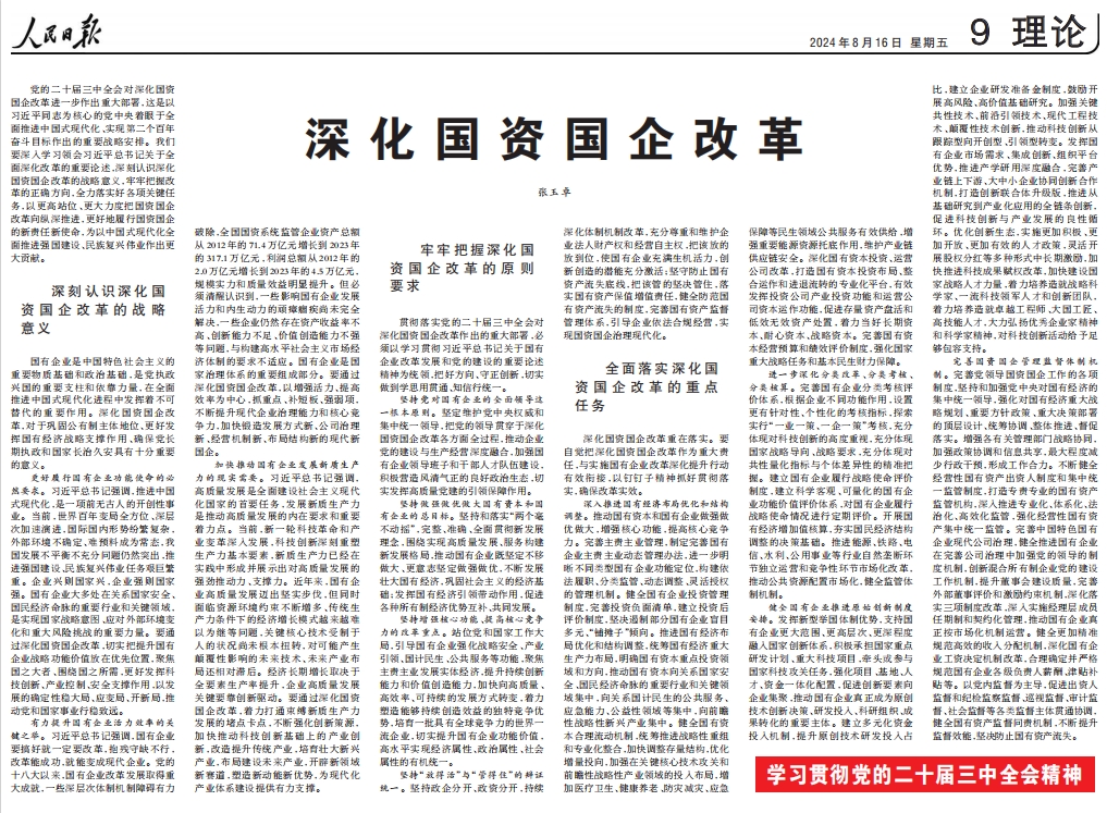 党的二十届三中全会对深化国资国企改革进一步作出重大部署,这是以习近平同志为核心的党中央着眼于全面推进中国式现代化、实现第二个百年奋斗目标作出的重要战略安排。我们要深入学习领会习近平总书记关于全面深化改革的重要论述,深刻认识深化国资国企改革的战略意义,牢牢把握改革的正确方向,全力落实好各项关键任务,以更高站位、更大力度把国资国企改革向纵深推进,更好地履行国资国企的新责任新使命,为以中国式现代化全面推进强国建设、民族复兴伟业作出更大贡献。