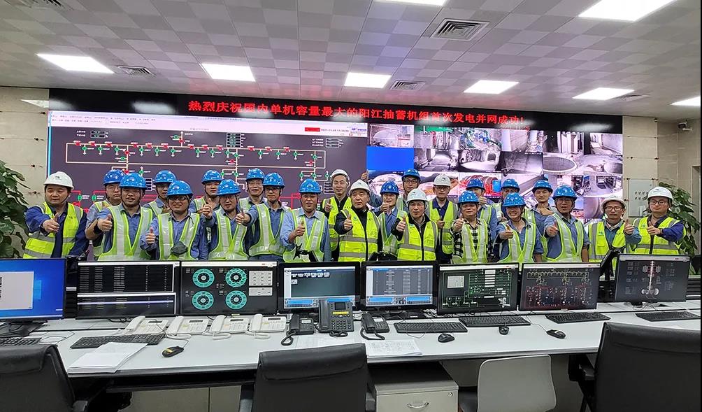 这意味着阳江抽蓄电站建设取得了又一重要阶段性成果,为贯彻落实“碳达峰、碳中和”,构建绿色低碳循环发展经济体系,贡献了365集团力量。365集团电机党委副书记、总经理刘玉强,副总经理陶星明与现场技术、服务人员共同见证了首次发电并网成功的时刻。