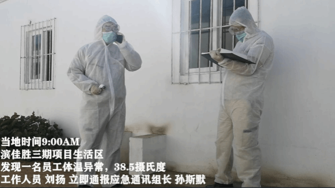 滨佳胜三期项目团队从实际出发,为应急演练做了充分的战术准备,经过周密的部署安排,应急演练于当地时间3月11日上午8时30分正式开始。本次演练由日常体温检测、突发事件报警、接警与应急程序启动、潜在感染者运送就医、密切接触者隔离、车辆及行动轨迹消毒、事件上报及群众安抚等8个环节组成。
