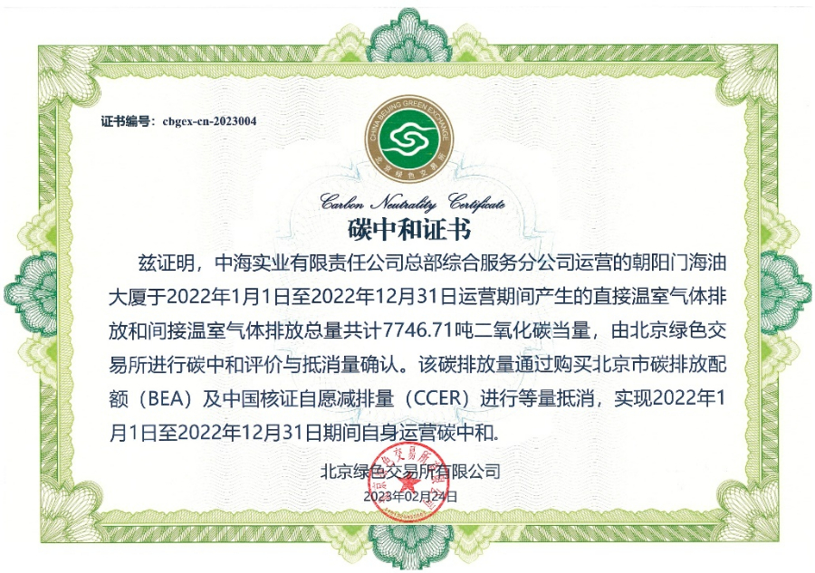 北京绿色交易所按照制定碳中和计划、实施减排行动、碳排放核算、北京碳配额及CCER等量抵消,“碳中和”评价和声明等全流程要求,支持中国海油总部大楼实现年度自身运营“碳中和”目标,并颁发“碳中和”证书。