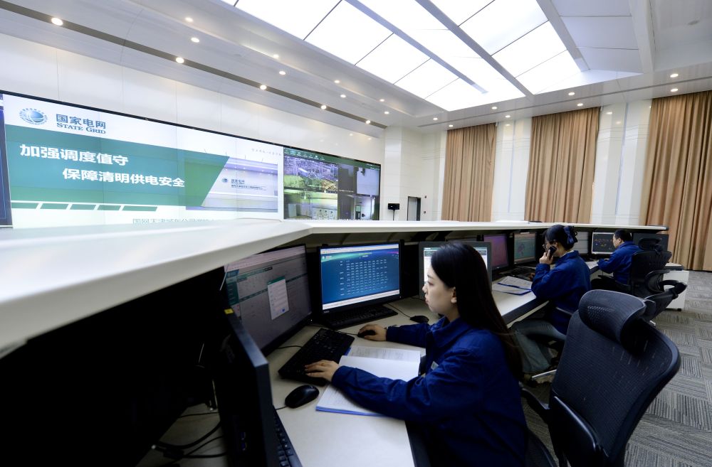 天津城东公司调度值班人员在监测区域电网运行状态。新华社发