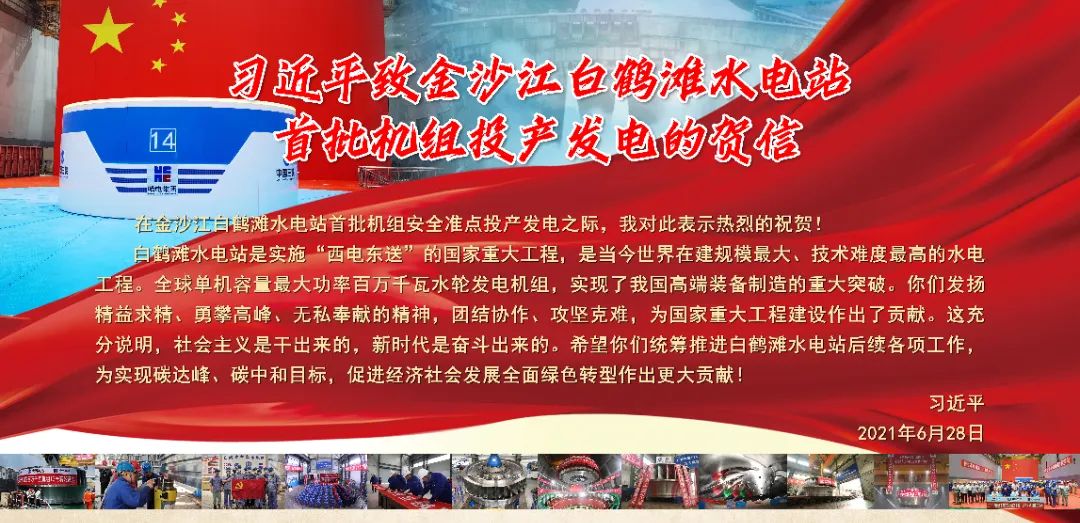2021年6月28日,金沙江白鹤滩水电站首批机组投产发电,中共中央总书记、国家主席、中央军委主席习近平致信祝贺,寄语广大项目建设者——统筹推进白鹤滩水电站后续各项工作,为实现碳达峰、碳中和目标,促进经济社会发展全面绿色转型作出更大贡献!