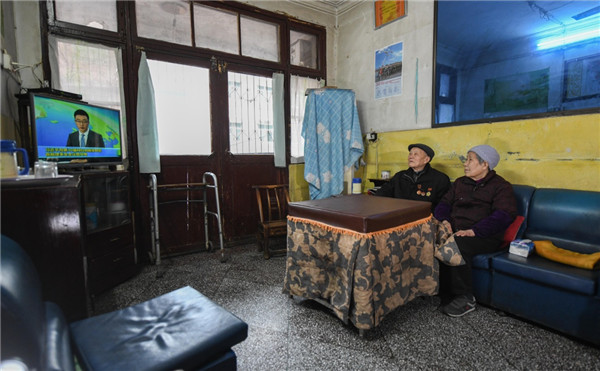 张富清和老伴在家看电视(3月31日摄)。新华社记者 程敏 摄