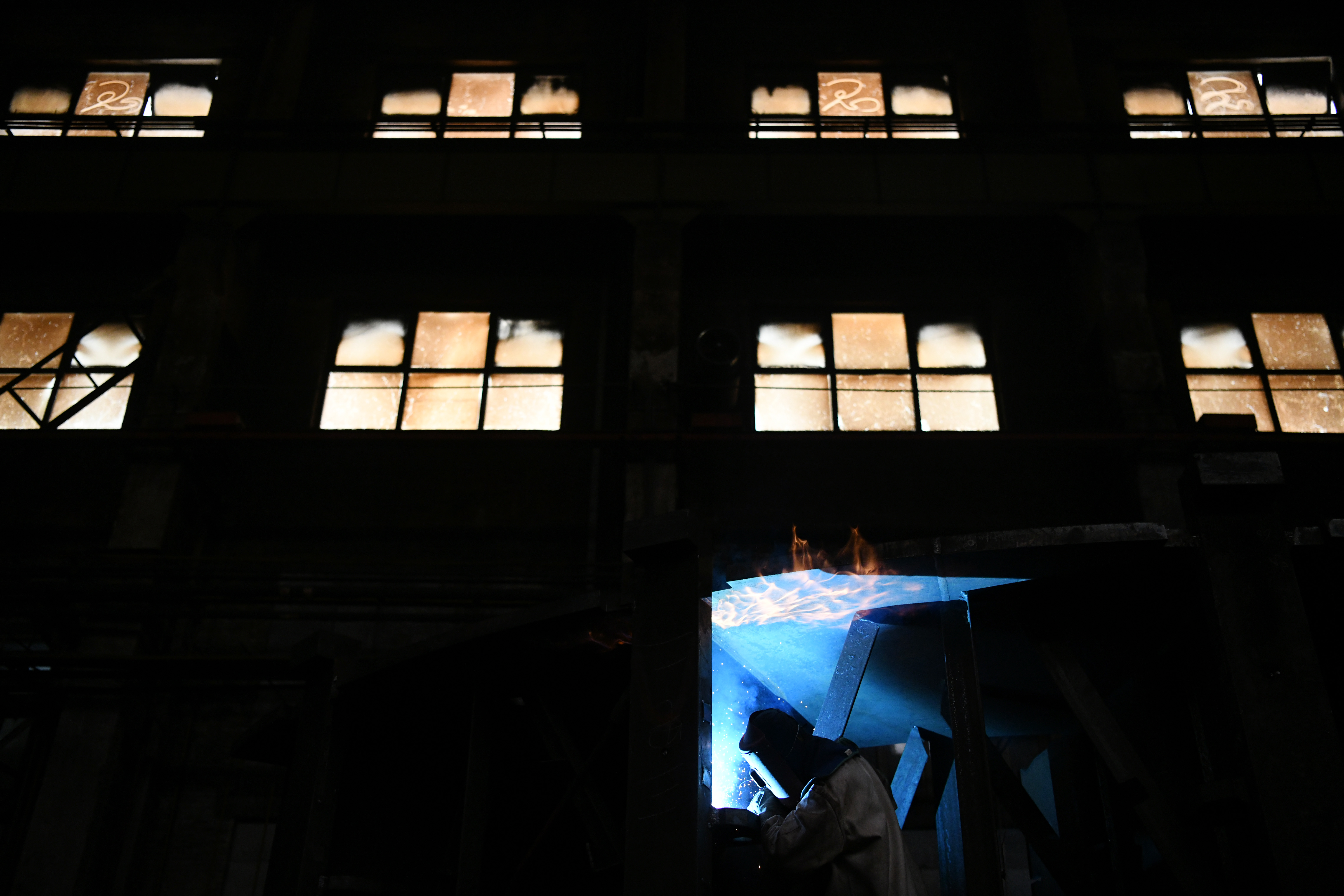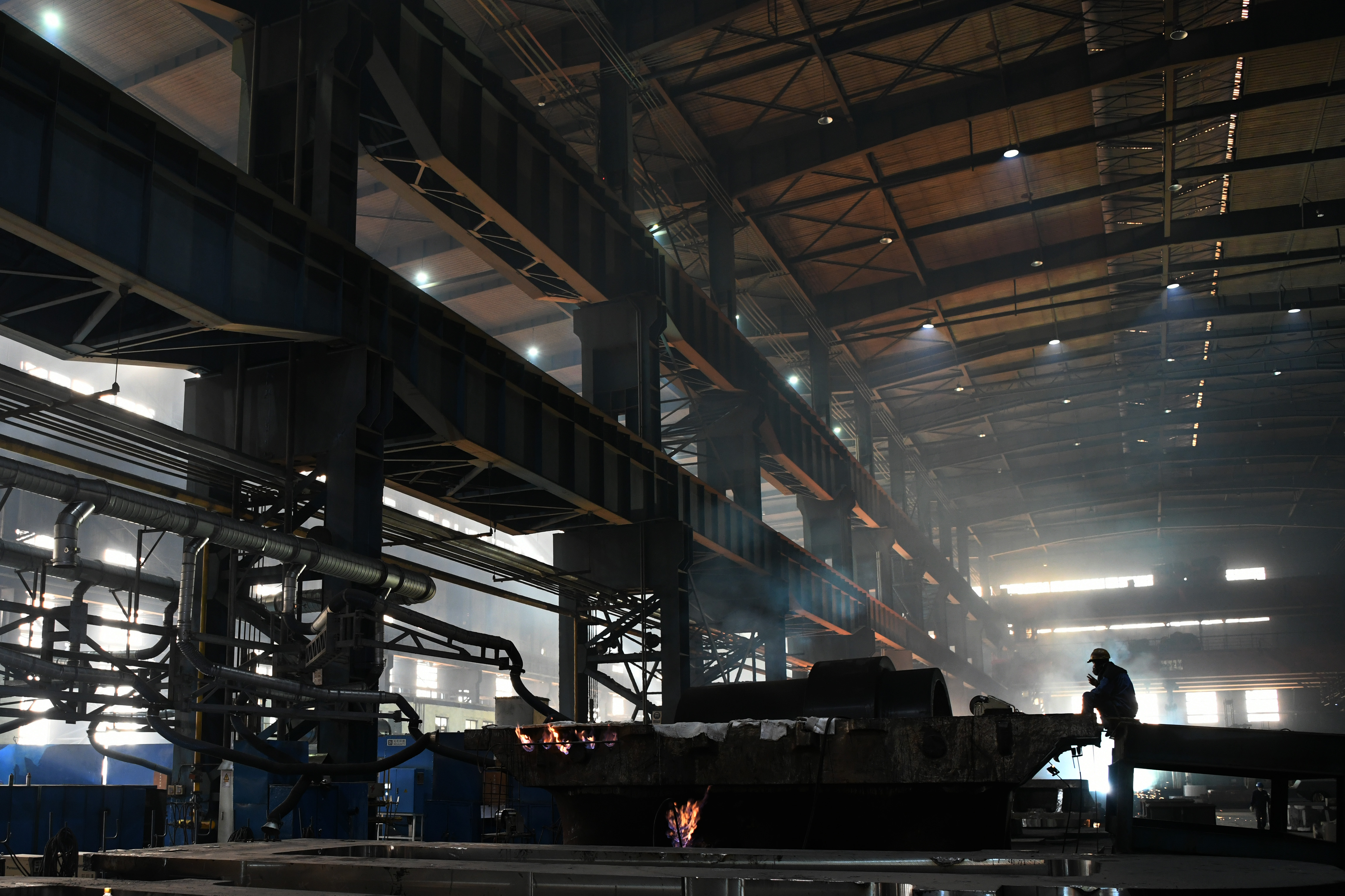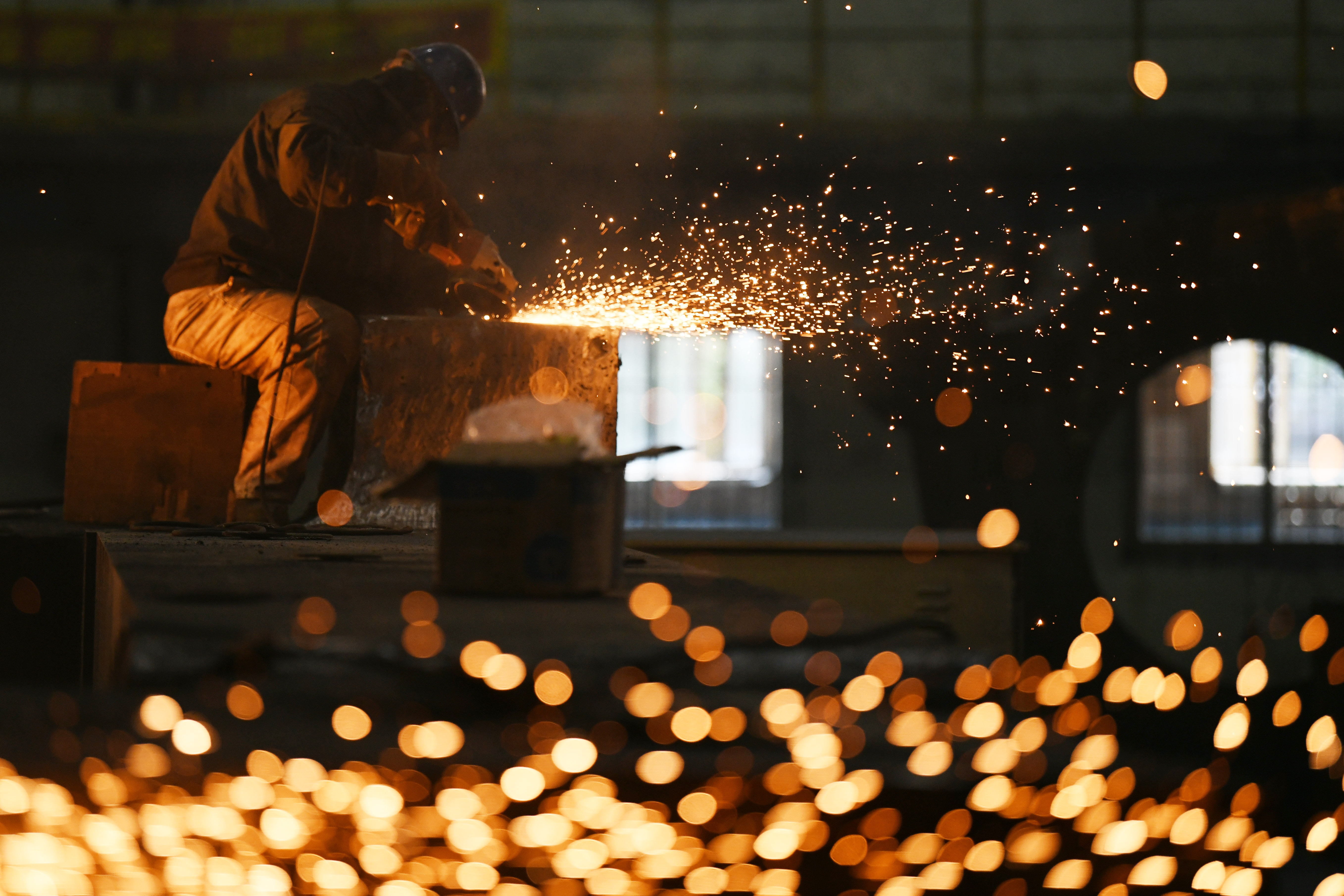 ↑在中国一重集团有限公司的厂房内,工人在进行生产作业(8月28日摄)。