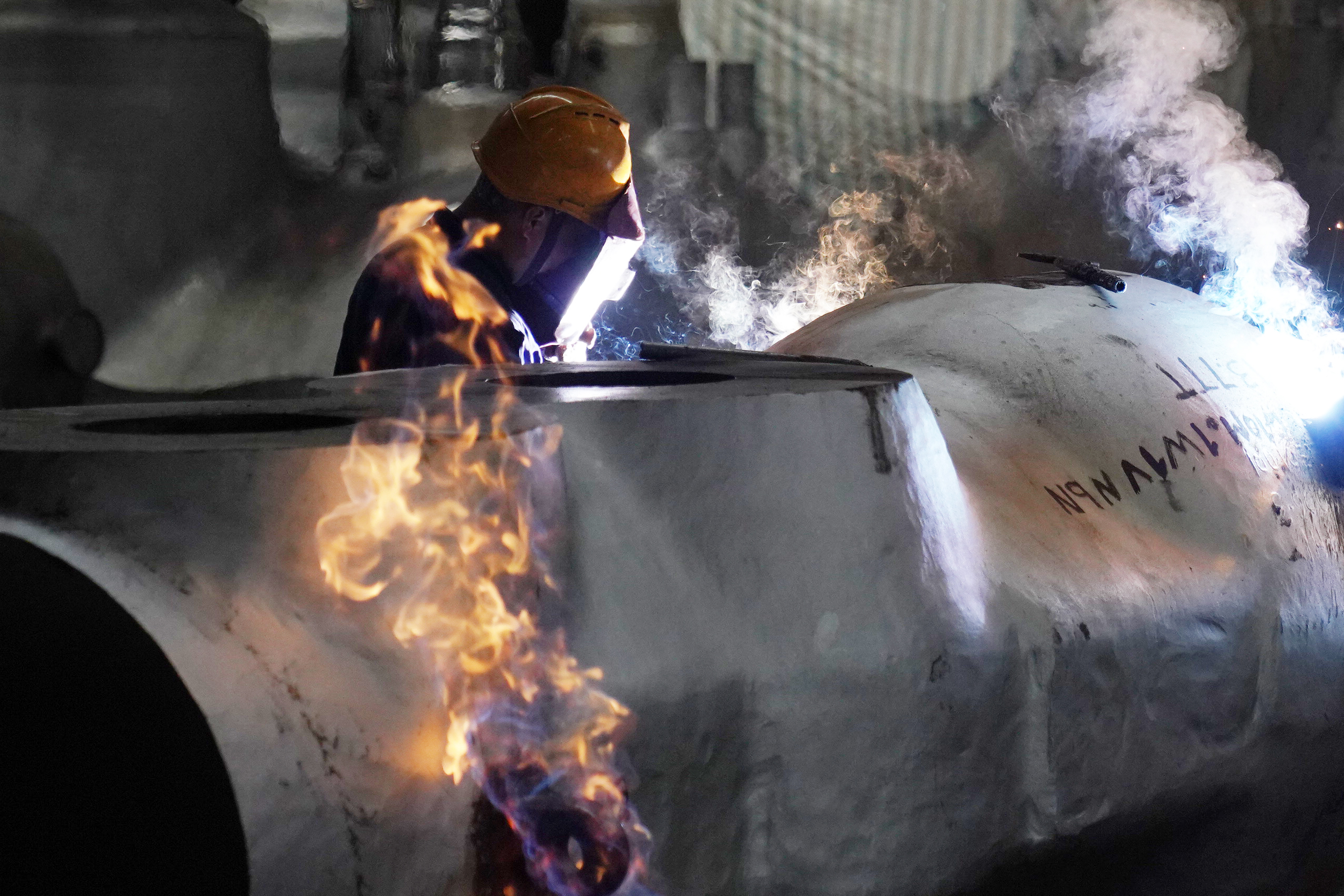 ↑在中国一重集团有限公司的厂房内,工人在进行生产作业(8月27日摄)。