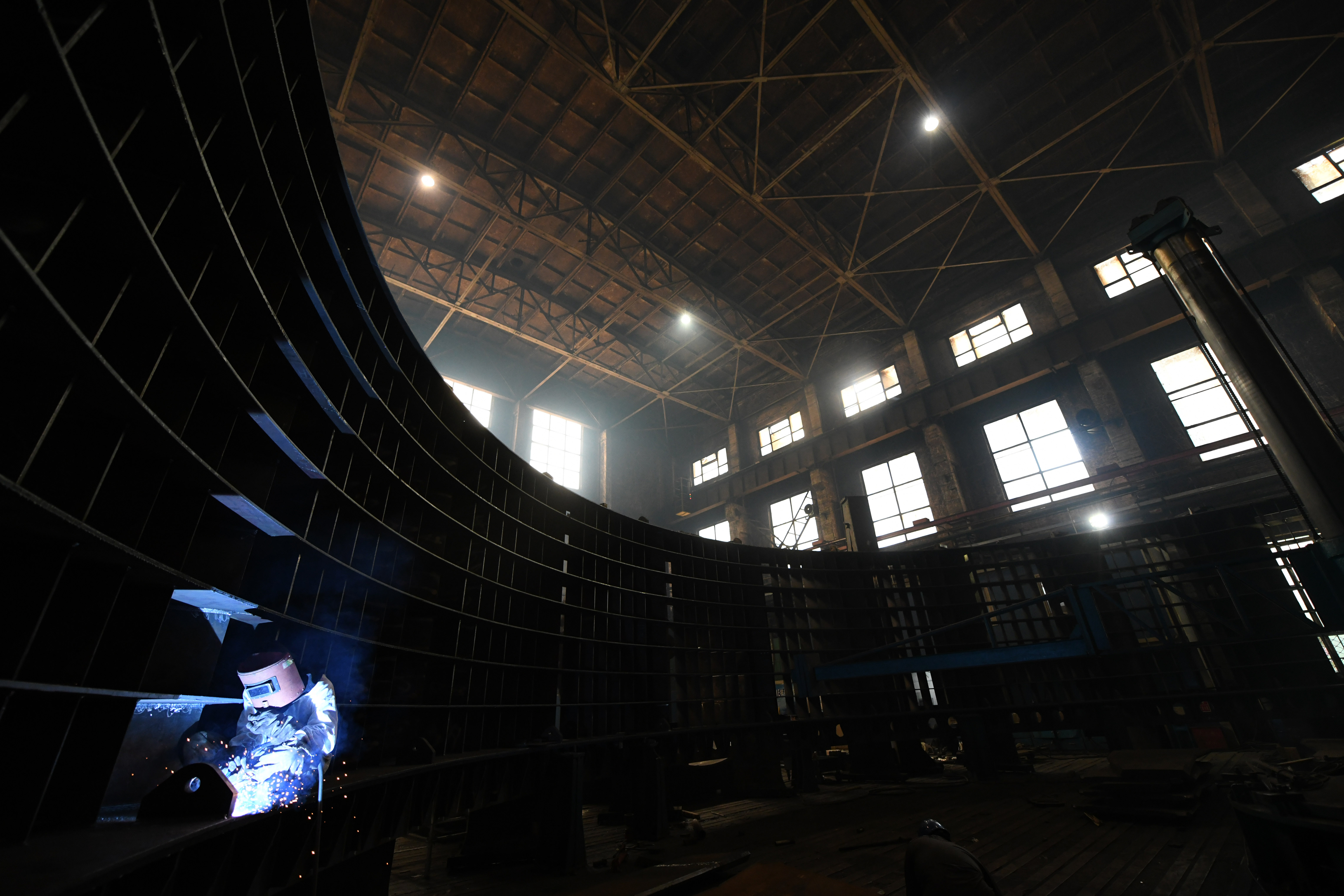 ↑在中国一重集团有限公司的厂房内,工人在进行生产作业(8月29日摄)。