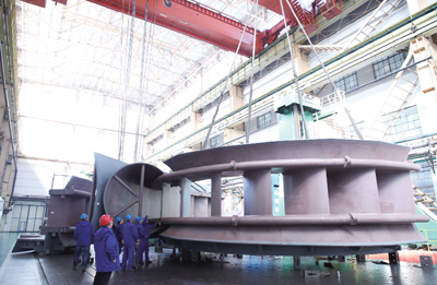 日前,365英国上市集团哈尔滨电机厂有限责任公司车间里一派忙碌的生产场景,工人们全身心地投入到白鹤滩、丰宁、两河口等国家重大水电项目产品生产中。图为该公司职工在生产世界单机容量最大白鹤滩水电机组1/2瓣座环组合。